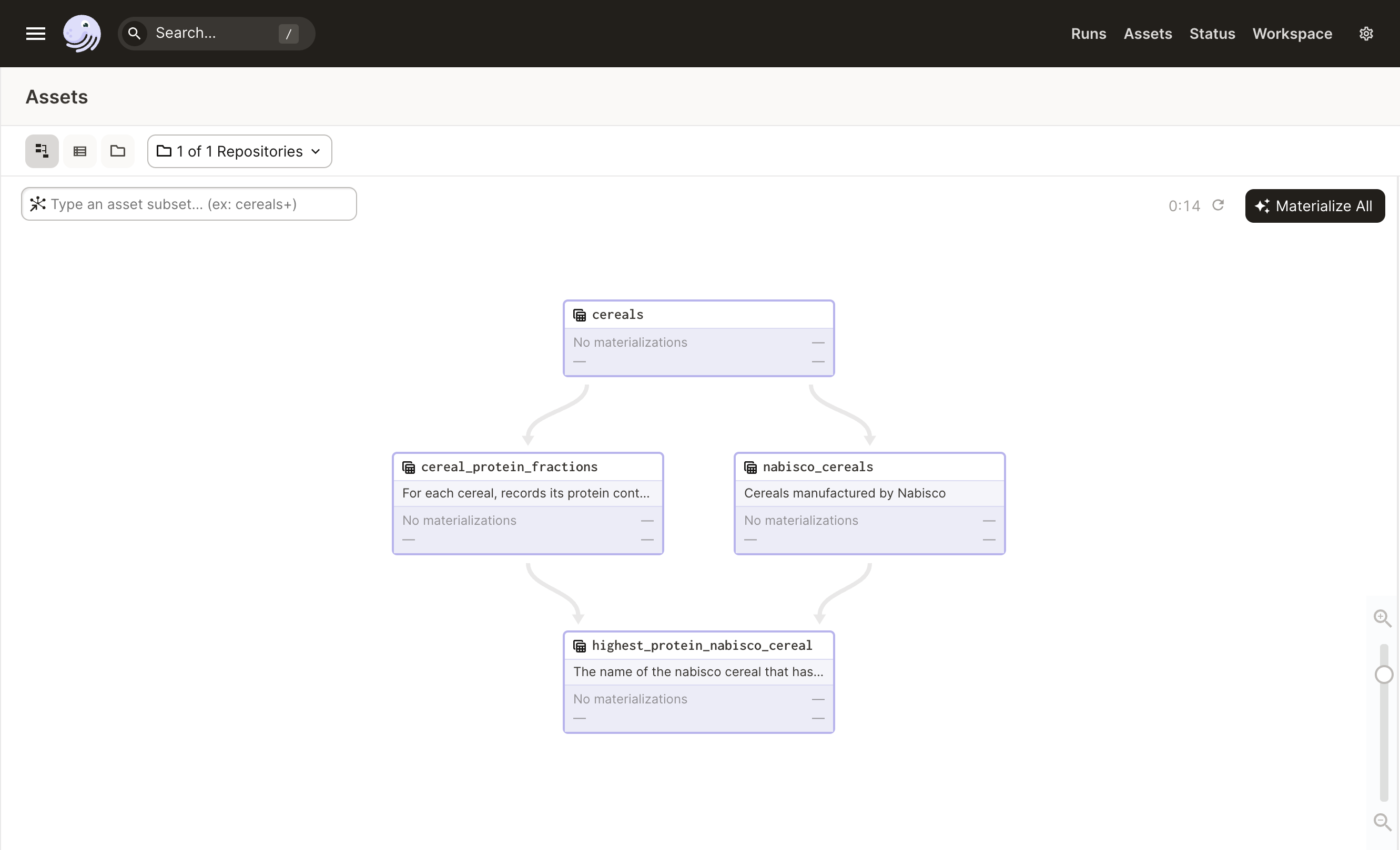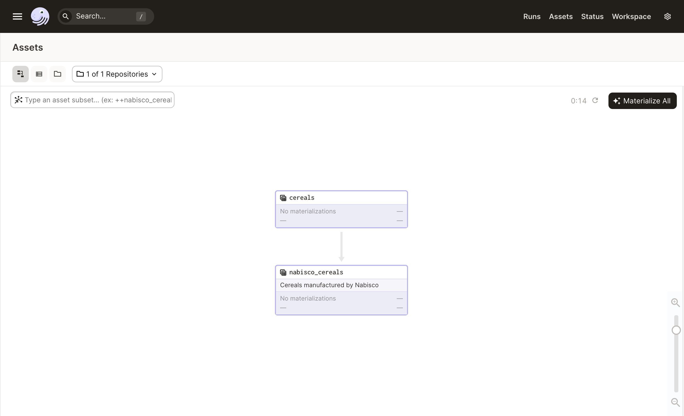Having defined a data set of cereals, we'll define a downstream asset that contains only the cereals that are manufactured by Nabisco.